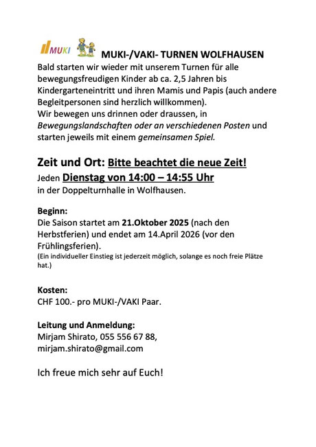 Für Kinder ab 3 Jahren, nach den Herbstferien bis zu den Frühlingsferien, jeweils am Dienstagnachmittag